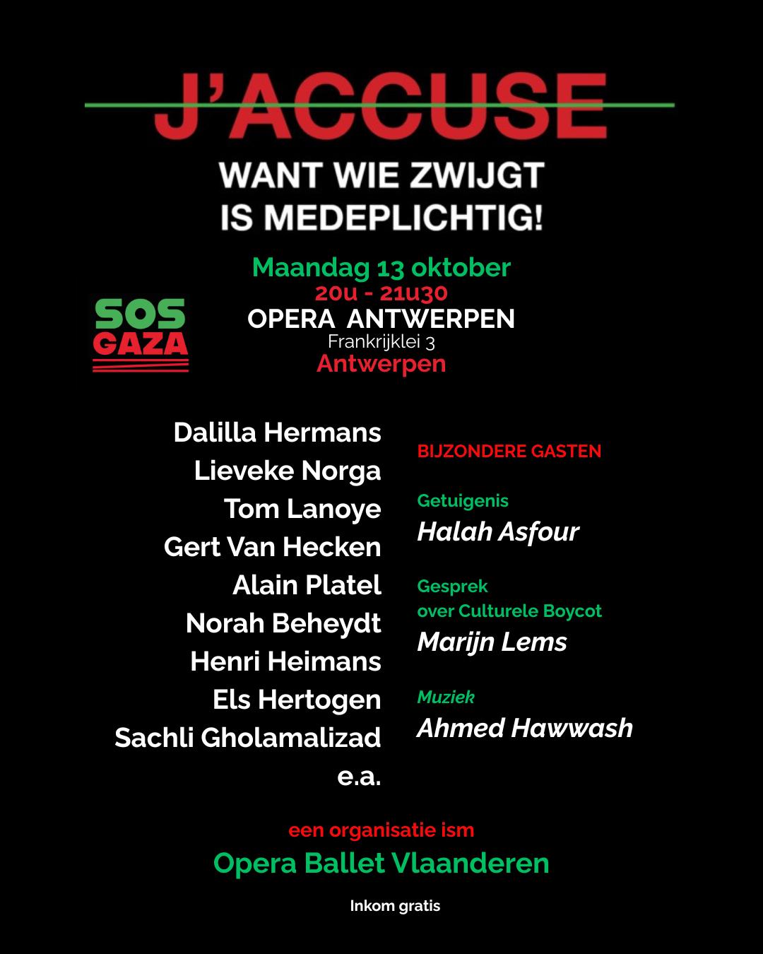 LINE UP: -Dalilla Hermans-Lieveke Norga-Tom Lanoye-Gert Van Hecken-Alain Platel-Norah Beheydt-Henri Heimans-Els Hertogen-Sachli Gholamalizad Getuigenis van Halah AsfourDuiding over Culturele Boycot: M...