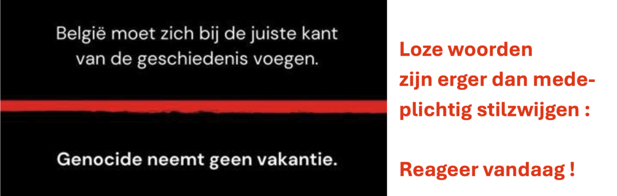 We zijn al maanden getuige van de eerste genocide in de geschiedenis die live op televisie te volgen is. Bij ons in België eist een overweldigende meerderheid van de bevolking onmiddellijke sancties en doortastende maatregelen om een einde te maken aan de misdaden tegen de menselijkheid en het gebruik van hongersnood als massavernietigingswapen. Het zijn niet alleen de beelden en emoties of de oproepen van de Palestijnen, maar ook de cijfers, de officiële rapporten en de standpunten van de hoogste internationale rechtbanken die de overgrote meerderheid van onze medeburgers mobiliseren. Zelfs Israëlische organisaties noemen wat er gebeurt genocide!1