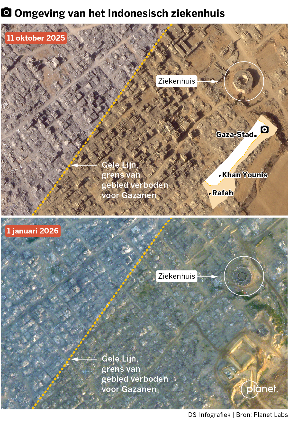 Beelden die de Israëlische openbare omroep Kan eind december maakte in Noord-Gaza, tonen dat daar soortgelijke praktijken plaatsvinden. Het leger heeft sinds het bestand een basis gebouwd in de buurt van het Indonesische Ziekenhuis. Dat gebouw hadden de Israëli’s al meerdere keren aangevallen en is al meer dan een halfjaar buiten gebruik. Nu is het ziekenhuis zowat het enige gebouw dat nog rechtstaat in een zee van verpulverd beton. Bijna de hele dichtbevolkte wijk rond het achthoekige ziekenhuisgebouw is tegen de vlakte gewerkt. Uit satellietfoto’s blijkt dat een deel van de vernieling is aangericht na het staakt-het-vuren.