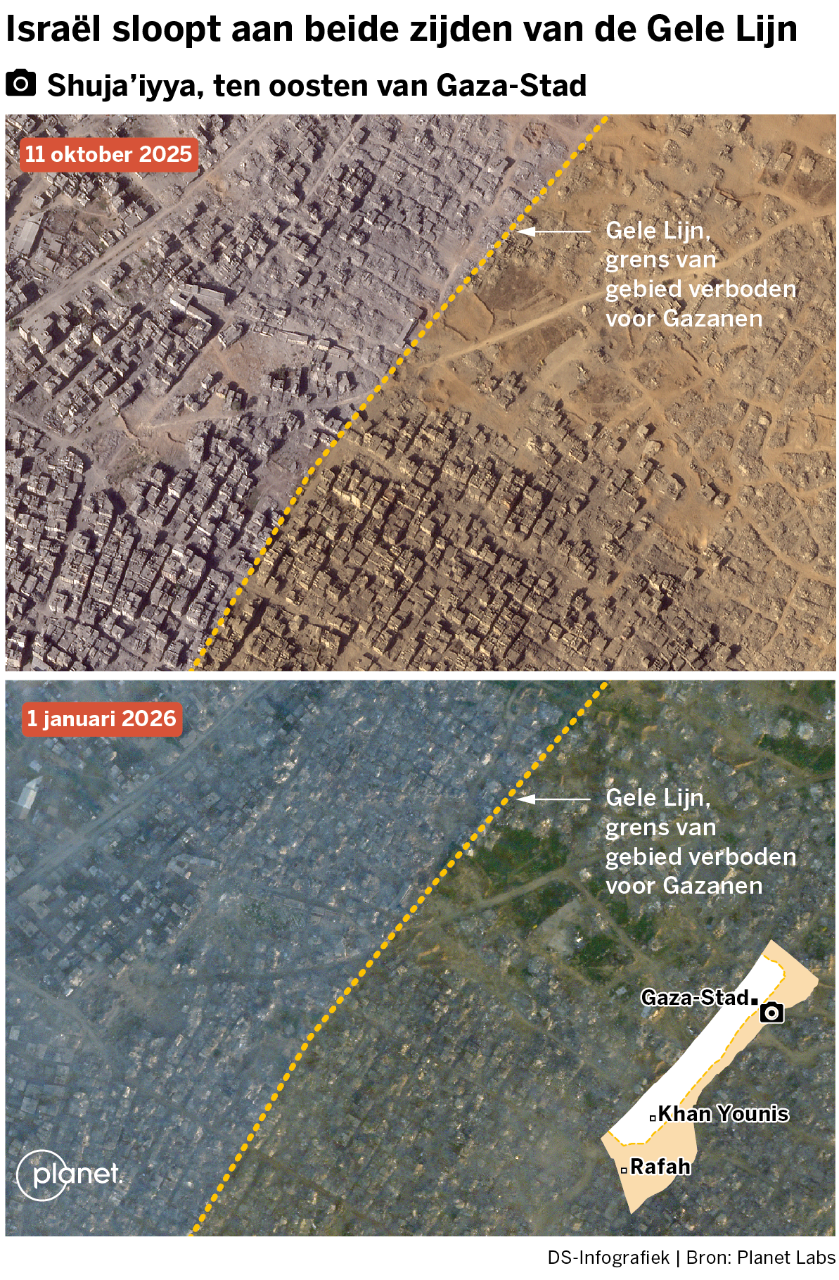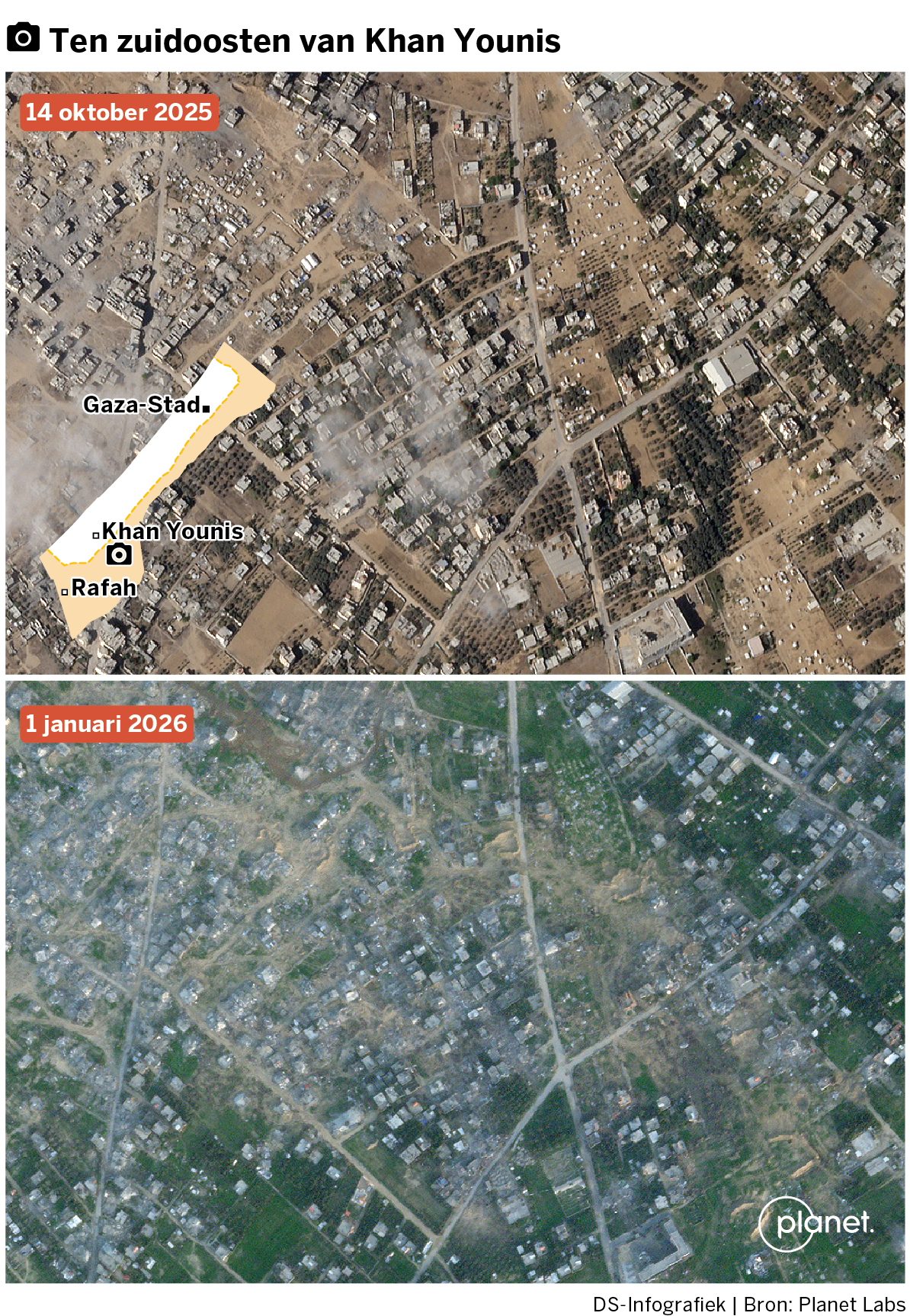 De Israëli’s zetten hun sloopoperaties voort in gebieden waaruit ze zich volgens het akkoord met Hamas in een latere fase van het bestand zouden moeten terugtrekken. Dat houdt grootschalige vernieling niet tegen. Bijna dagelijks komen berichten uit Gaza over explosies in het gebied dat Israël bezet houdt. Satellietbeelden laten toe om de situatie van vandaag te vergelijken met die net na de start van het bestand. Zo blijkt dat enkele verwoeste wijken ten zuidoosten van de stad Khan Younis nog rechtstonden op 14 oktober, toen het staakt-het-vuren al van kracht was.